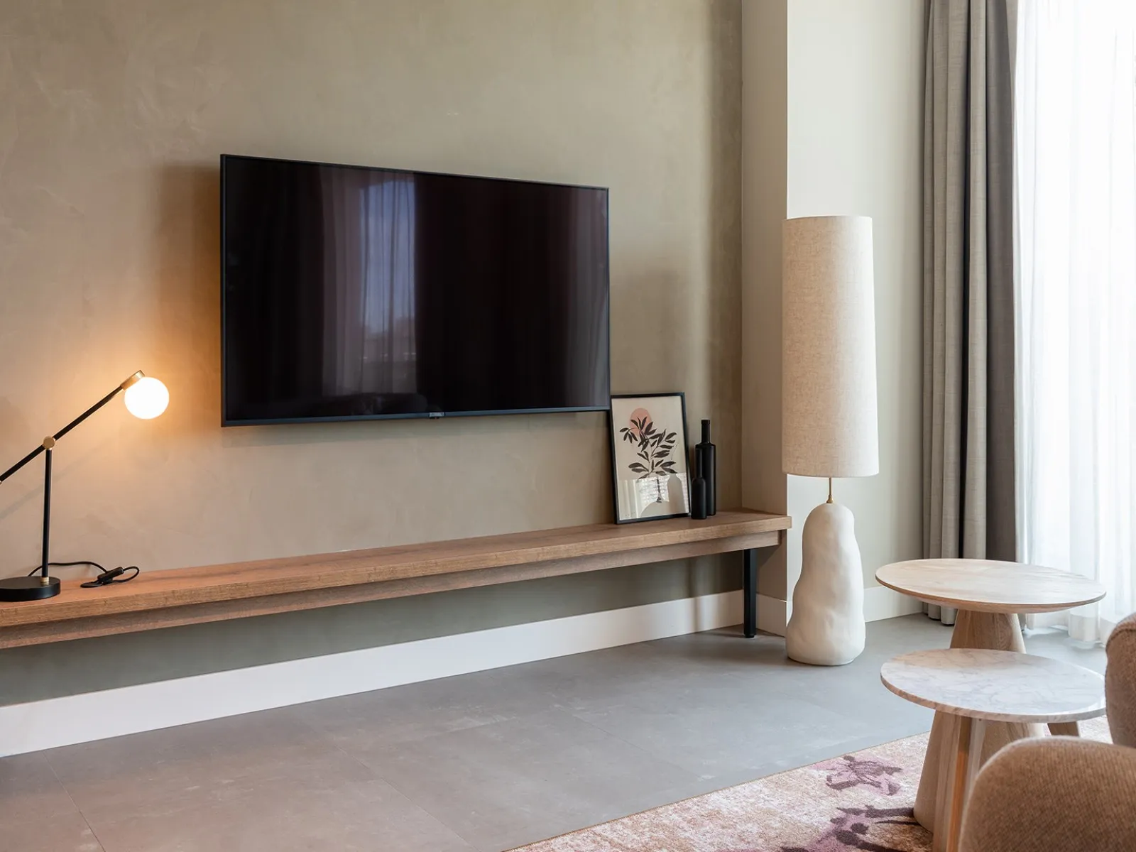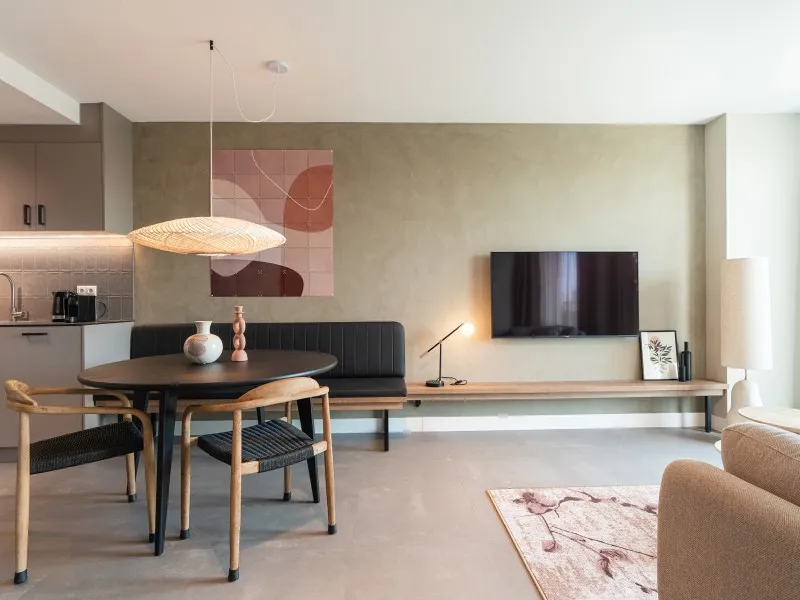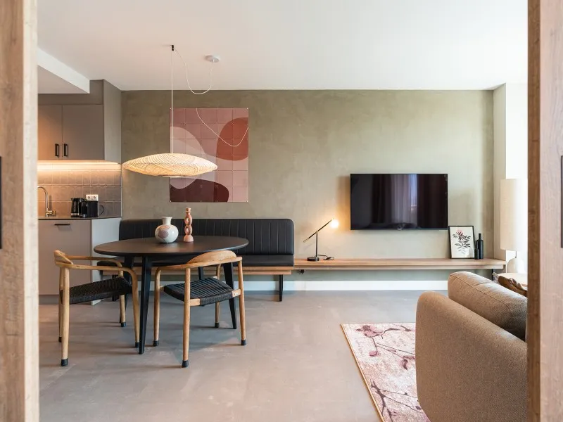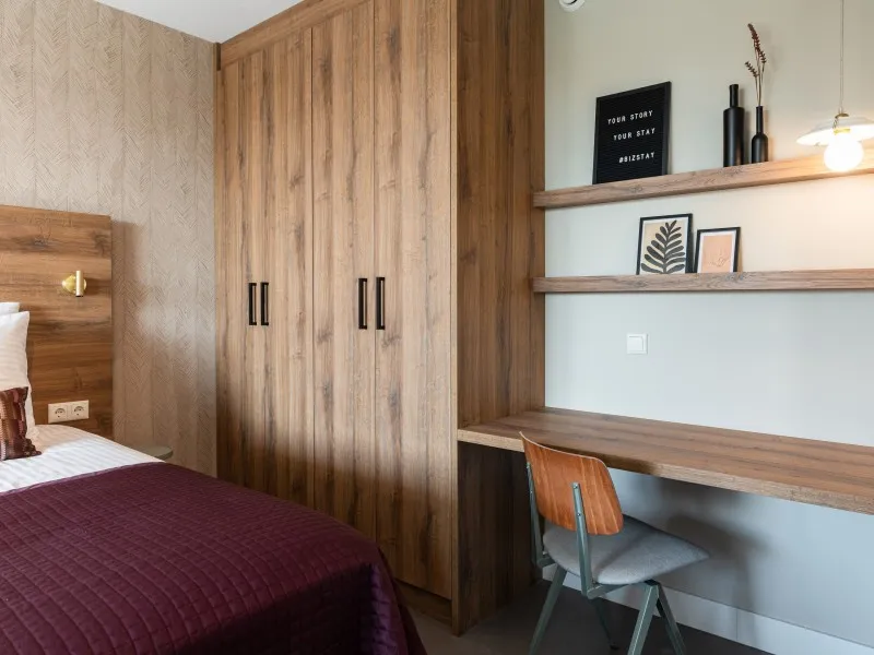 This 1-bedroom apartment, spanning 60 sqm, provides a more spacious option compared to the studio. It comfortably accommodates up to 2 guests and is suitable for both short and long stays. Upon entry, you'll immediately experience the inviting ambiance, consistently reflected in the interior design, characterized by a blend of natural colors and materials with contemporary technology. The apartment features a well-equipped kitchen, a dining area, a cozy sofa, and a large SMART TV with Chromecast. In the bedroom, you'll find a spacious and comfortable bed, a second SMART TV with Chromecast, a desk, and ample closet space. The generous bathroom includes a shower, a vanity with drawers, and a heated mirror. There's a separate toilet and a dedicated laundry room with a washing machine and dryer. The apartment also boasts a 4 sqm balcony. Notably, the electricity and heat you'll use during your stay are predominantly generated by solar collectors, contributing to the sustainability of BizStay Walden, making it an eco-friendly building.